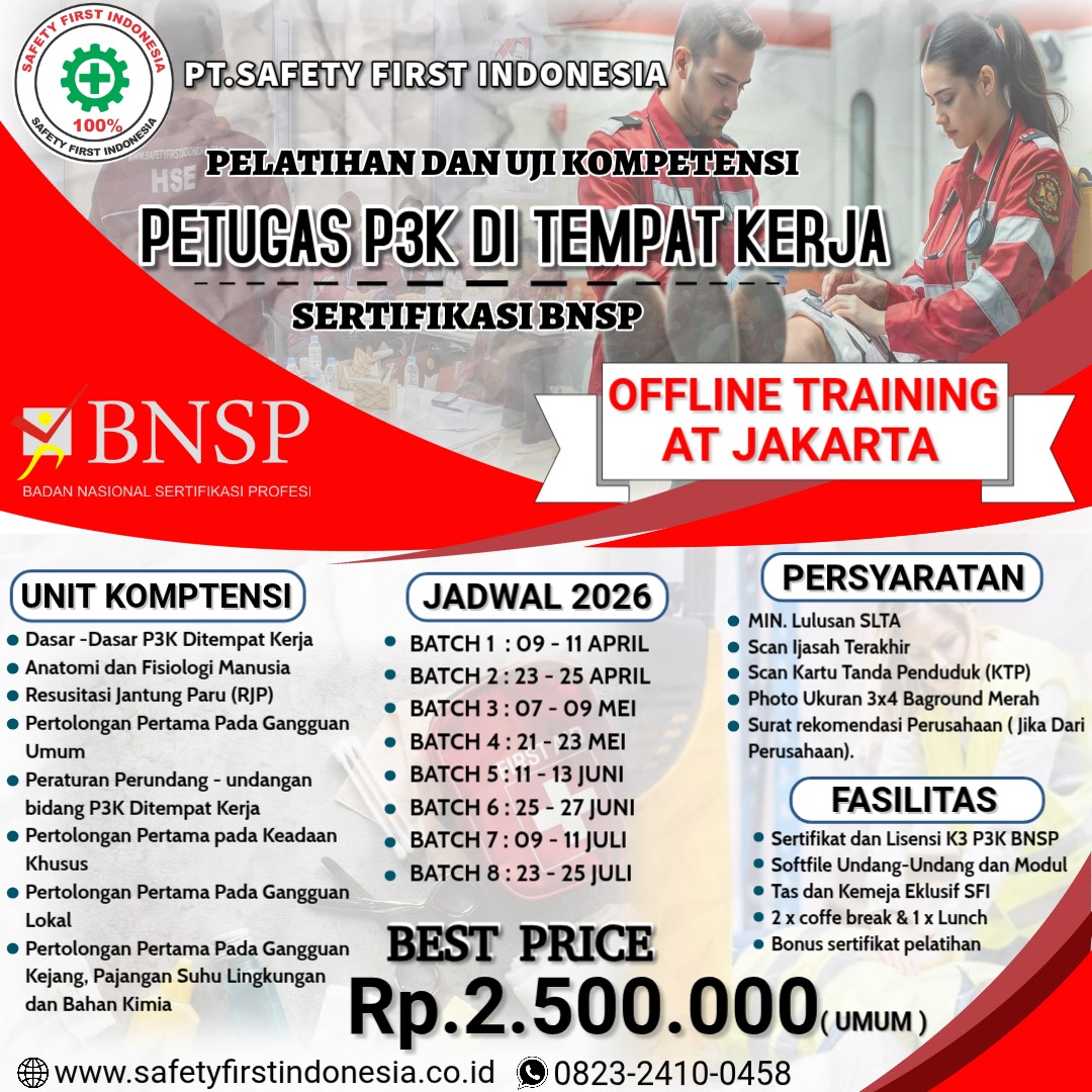 Pelatihan dan Uji Kompetensi Petugas P3K di Tempat Kerja Sertifikasi BNSP Online P3K (Pertolongan Pertama Pada Kecelakaan) diperlukan di tempat kerja karena beberapa alasan penting berikut: Menangani kecelakaan dengan cepat Jika terjadi kecelakaan (misalnya tergores, terjatuh, luka bakar ringan), P3K dapat langsung digunakan sebelum korban mendapat perawatan medis…