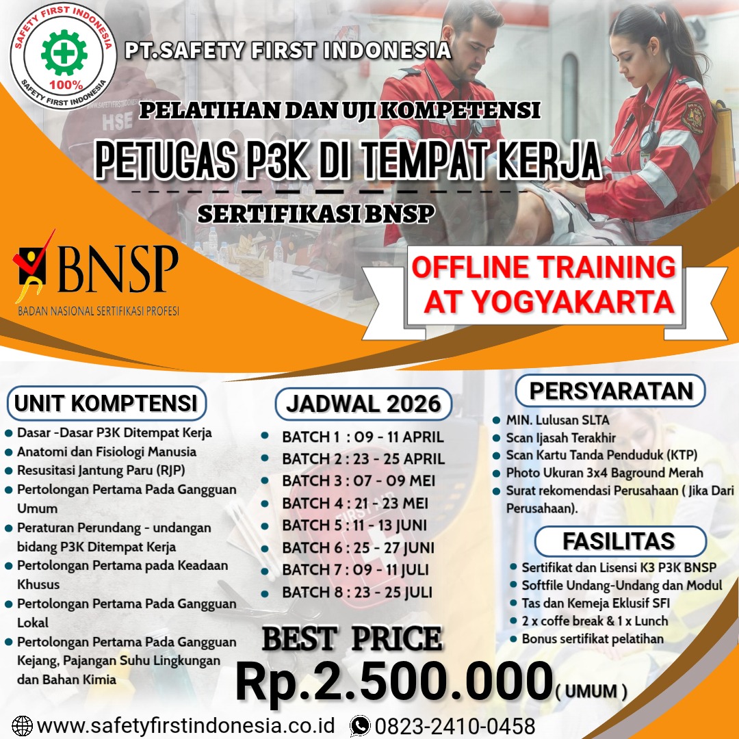Pelatihan dan Uji Kompetensi Petugas P3K di Tempat Kerja Sertifikasi BNSP Yogyakarta P3K (Pertolongan Pertama Pada Kecelakaan) diperlukan di tempat kerja karena beberapa alasan penting berikut: Menangani kecelakaan dengan cepat Jika terjadi kecelakaan (misalnya tergores, terjatuh, luka bakar ringan), P3K dapat langsung digunakan sebelum korban mendapat perawatan medis…