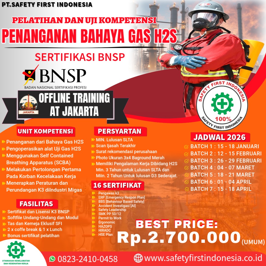 Pelatihan Dan Uji Kompetensi penanganan bahaya gas H2S Sertifiaksi BNSP Online Pelatihan dan uji Kompetensi Bahaya Gas Penanganan H2S K3 H?S adalah bagian dari Keselamatan dan Kesehatan Kerja (K3) yang khusus membahas bahaya gas hidrogen sulfida (H?S) serta cara mencegah kecelakaan dan gangguan kesehatan akibat paparan gas tersebut…