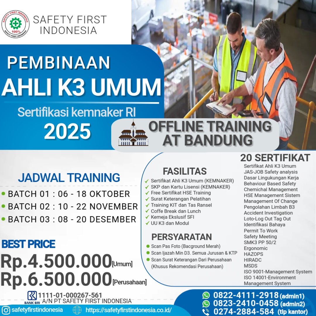 PEMBINAAN AHLI K3 UMUM Sertifikasi kemnaker RI 2025 OFFLINE TRAINING AT BANDUNG JADWAL TRAINING: JADWAL TRAINING 2025 BATCH 01 : 06 - 18 OKTOBER BATCH 02 : 10 - 22 NOVEMBER BATCH 03 : 08 - 20 DESEMBER BEST PRICE: Rp.4.500.000[Umum] Rp.6.500.000[Perusahaan] PEMBAYARAN MELALUI TRANSFER VIA…