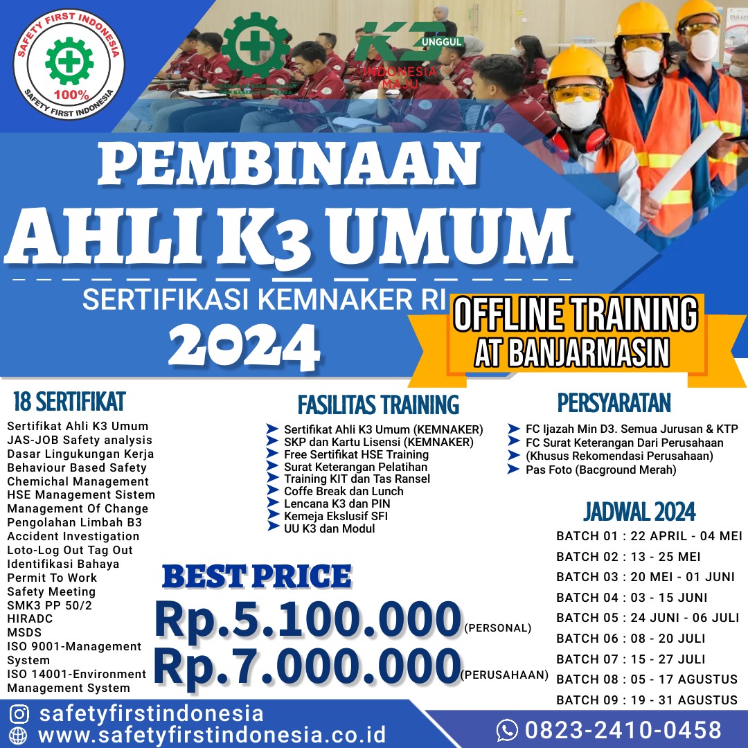 PELATIHAN OFFILNE SERTIFIKASI KEMNAKER RI 2024 BANJARMASIN 18 SERTIFIKAT: Sertifikat Ahli K3 Umum JAS-JOB Safety analysis Dasar Lingukungan Kerja Behaviour Based Safety Chemichal Management HSE Management Sistem Management Of Change Pengolahan Limbah B3 Accident Investigation Loto-Log Out Tag Out Identifikasi Bahaya Permit To Work Safety Meeting SMK3 PP 50/2…