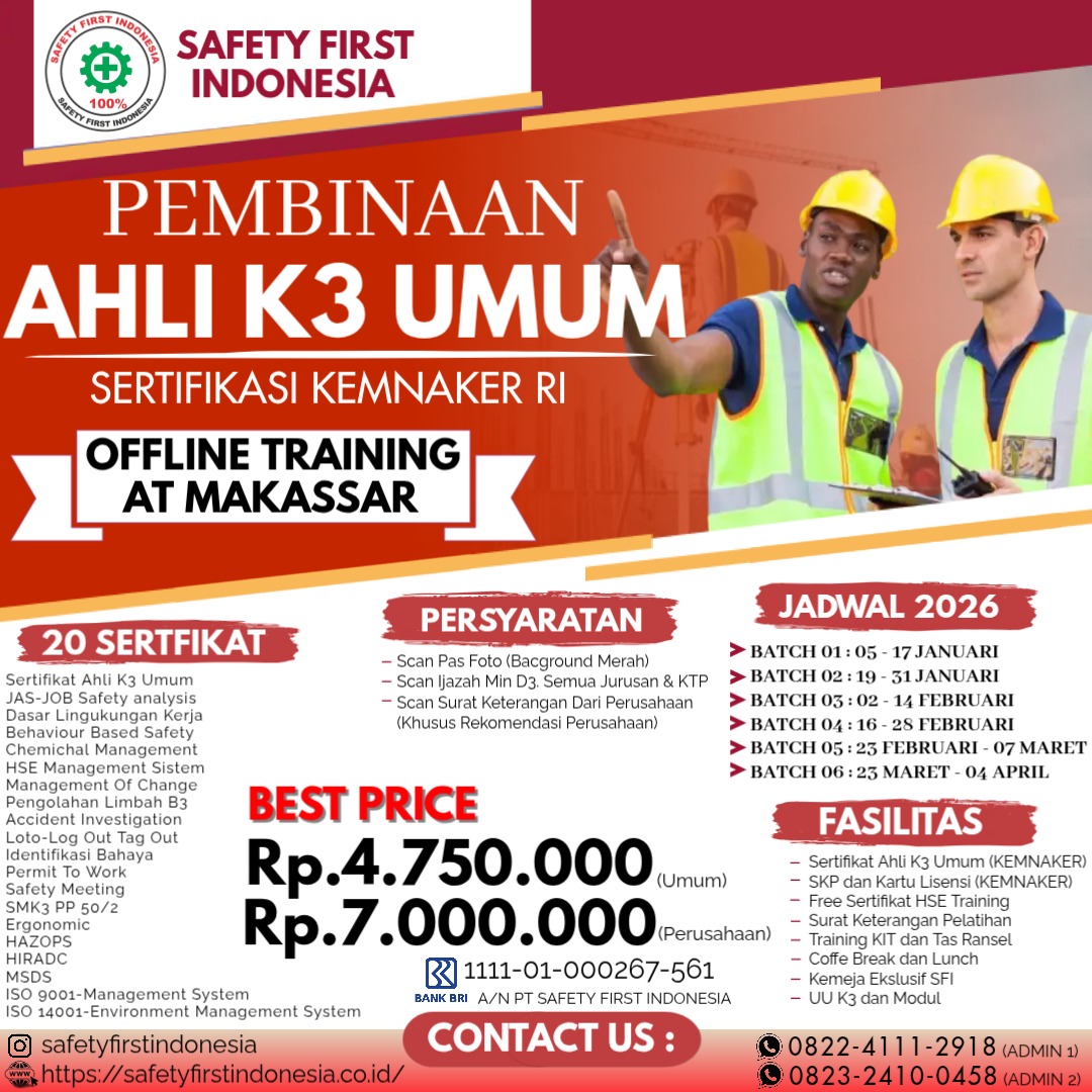 Jadwal Pelatihan Offline Ahli k3 Umum 2026 Makasar PEMBINAAN AHLI K3 UMUM SERTIFIKASI KEMNAKER RI 2026 OFFLINE TRAINING AT MAKASAR JADWAL KEGIATAN 2026: Batch 01 : 05 - 17 JANUARI Batch 02 : 19 - 31 JANUARI Batch 03 : 02 - 14 FEBRUARI Batch 04 :…