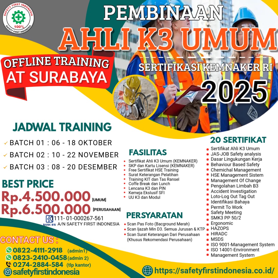 PEMBINAAN AHLI K3 UMUM OFFLINE TRAINING AT SURABAYA SERTIFIKASI KEMNAKER RI 2025 JADWAL TRAINING 2025: BATCH 01 : 06 - 18 OKTOBER BATCH 02 : 10 - 22 N0VEMBER BATCH 03 : 08 - 20 DESEMBER FASILITAS: Sertifikat Ahli K3 Umum (KEMNAKER) SKP dan Kartu Lisensi (KEMNAKER)…