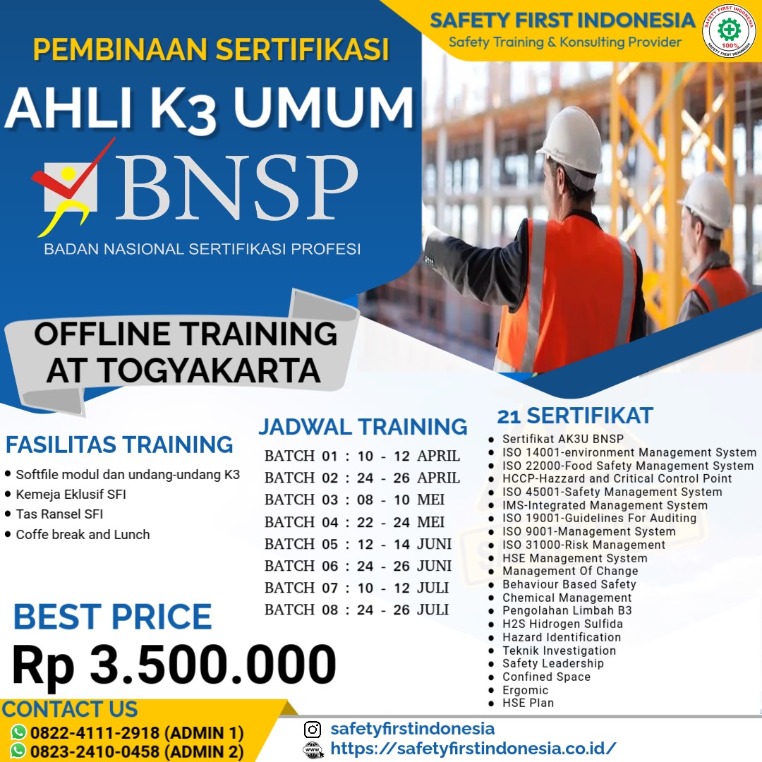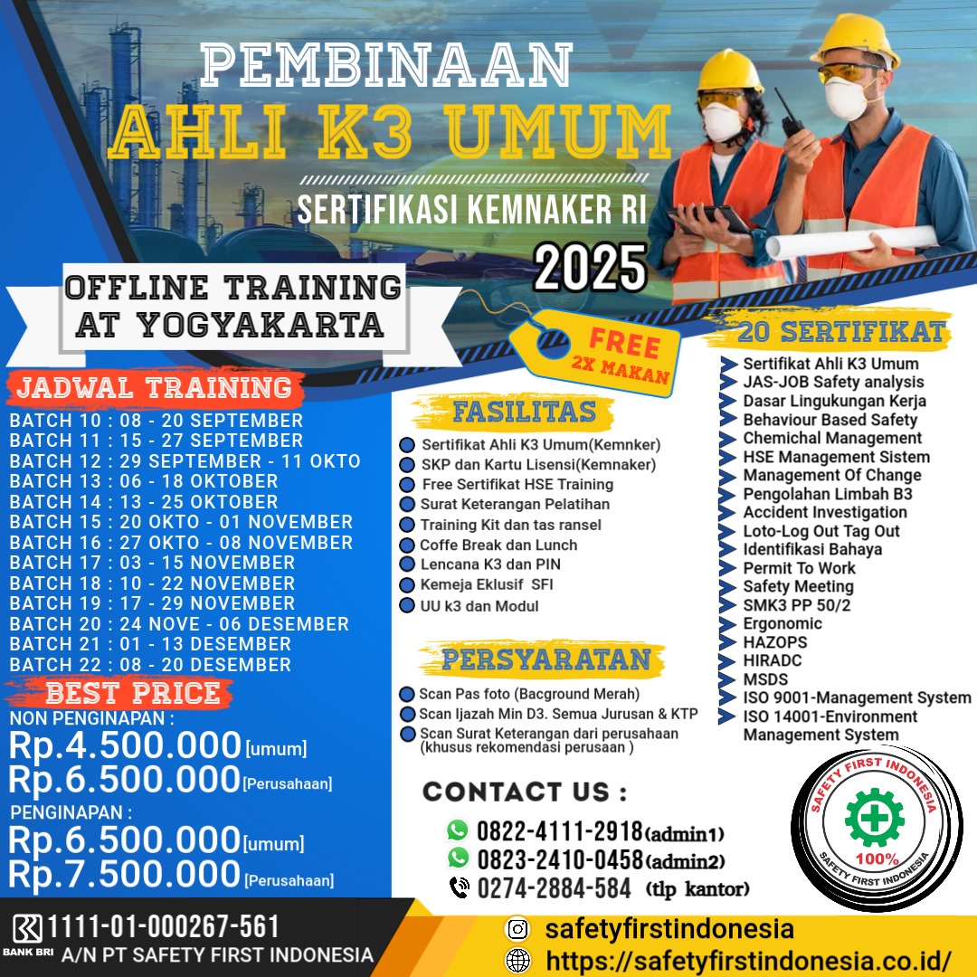 PEMBINAAN AHLI K3 UMUM SERTIFIKASI KEMNAKER RI OFFLINE TRAINING AT YOGYAKARTA JADWAL 2025 BATCH 10 : 08 - 20 SEPTEMBER BATCH 11 : 15 - 27 SEPTEMBER BATCH 12 : 29 SEPTEMBER - 11 OKTO BATCH 13 : 06 - 18 OKTOBER BATCH 14 : 13 - 25…