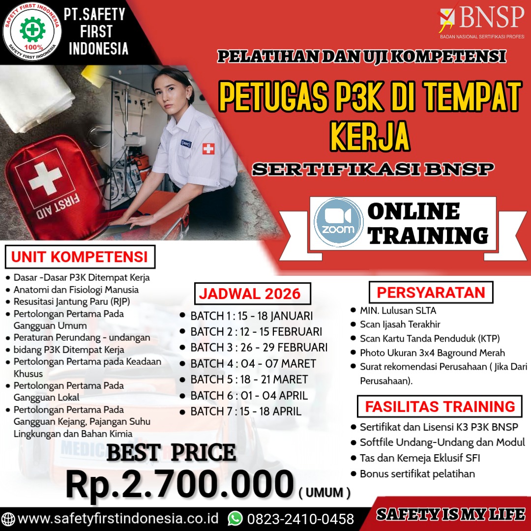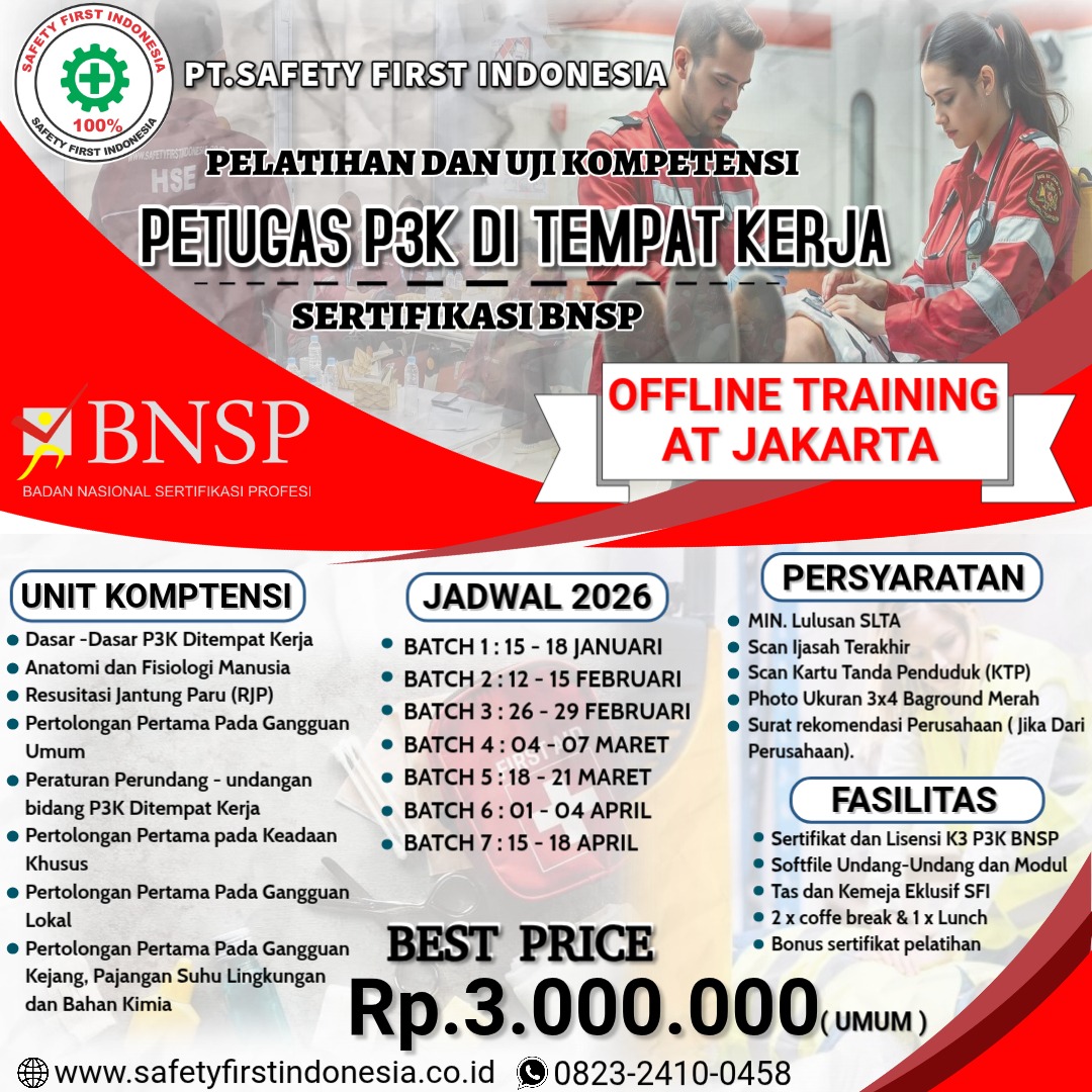 PT SAFETY FIRST INDONESIA 100% Safety Training & Konsulting Provider PEMBINAAN SERTIFIKASI AHLI K3 UMUM BNSP BADAN NASIONAL SERTIFIKASI PROFESI 2026 ONLINE TRAINING      JADWAL 2026:   BATCH 01: 1214 JANUARI BATCH 02: 26-28 JANUARI BATCH 03 09 11 FEBRUARI  BATCH 04:23-25 FEBRUARI BATCH 05:09-11 MARET BATCH 06: 30…