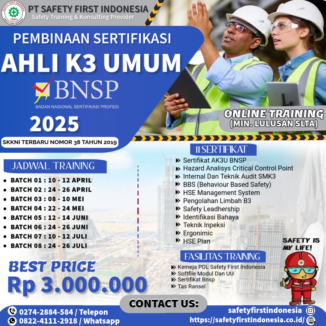 PT SAFETY FIRST INDONESIA 100% Safety Training & Konsulting Provider PEMBINAAN SERTIFIKASI AHLI K3 UMUM BNSP BADAN NASIONAL SERTIFIKASI PROFESI 2025 ONLINE TRAINING (MIN. LULUSAN SLTA) SKKNI TERBARU NOMOR 38 TAHUN 2019   JADWAL 2025:     BATCH 01 : 10 - 12 APRIL  BATCH 02 : 24 - 26…