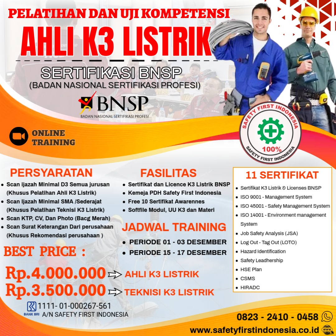 PELATIHAN AHLI K3 LISTRIK SERTIFIKASI BNSP 2025   PERSYARATAN MINIMAL SMA / SLTA   JADWAL    BATCH 01, 01 - 03 DESEMBER  BATCH 02. 15 - 17 DESEMBER   BIAYA Rp 4.000.000 / AHLI K3 LISTRIK Rp 3.500.000 / TEKNISI K3 LISTRIK   FASILITAS SERTIFKAT DAN LISESNI K3 LISTRIK BNSP…