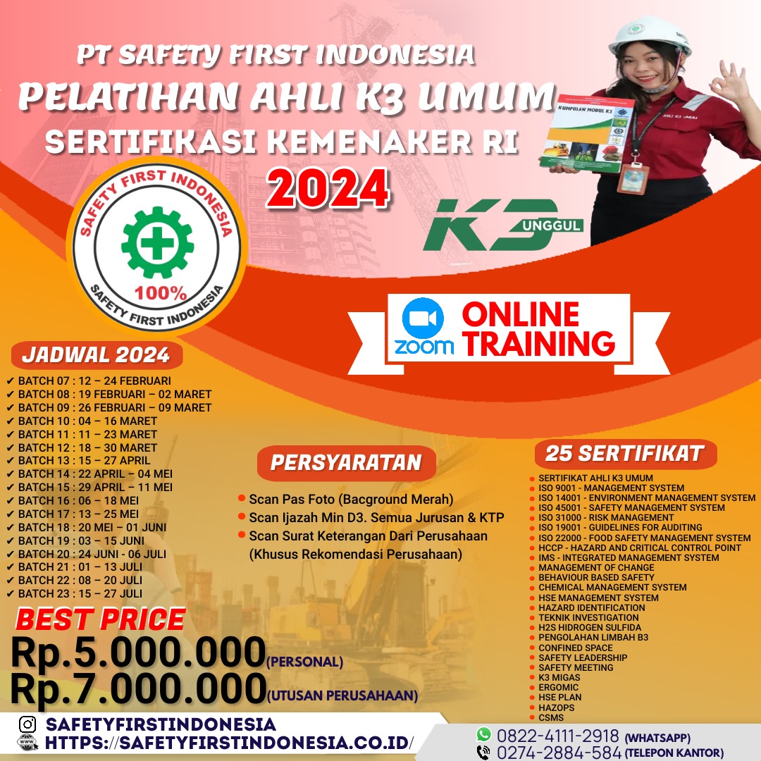 PT SAFETY FIRST INDONESIA PELATIHAN AHLI K3 UMUM SERTIFIKASI KEMENAKER RI 2024 ONLINE Zoom TRAINING JADWAL 2024 ? BATCH 07:12-24 FEBRUARI ?BATCH 08:19 FEBRUARI - 02 MARET ? BATCH 09:26 FEBRUARI - 09 MARET ?BATCH 10:04-16 MARET ?BATCH 11:11-23 MARET ?BATCH 12:18-30 MARET ? BATCH 13:15-27 APRIL ? BATCH…